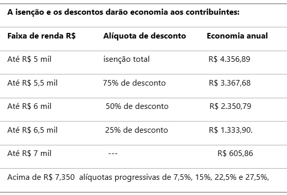 Atualmente, a tabela do Imposto de Renda prevê isenção para quem ganha até dois salários-mínimos por mês, o equivalente a R$ 3.036. A partir daí, a tributação ocorre de forma progressiva, até o limite de 27,5% de imposto.